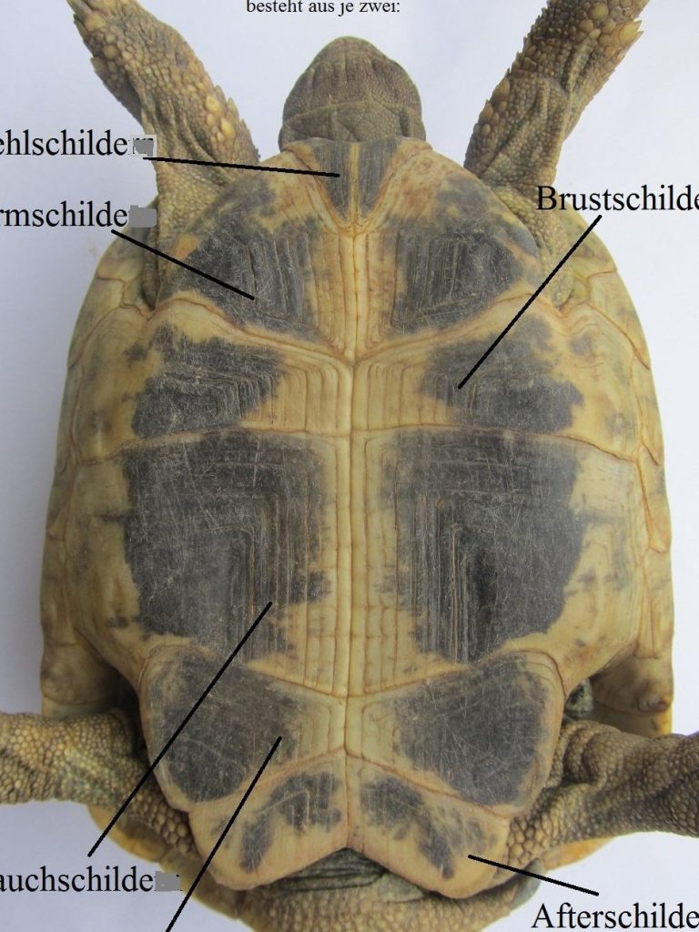 Der Bauchpanzer ist klein im Vergleich zum großen, breiten Rückenpanzer. Er ist gelblich gefärbt.